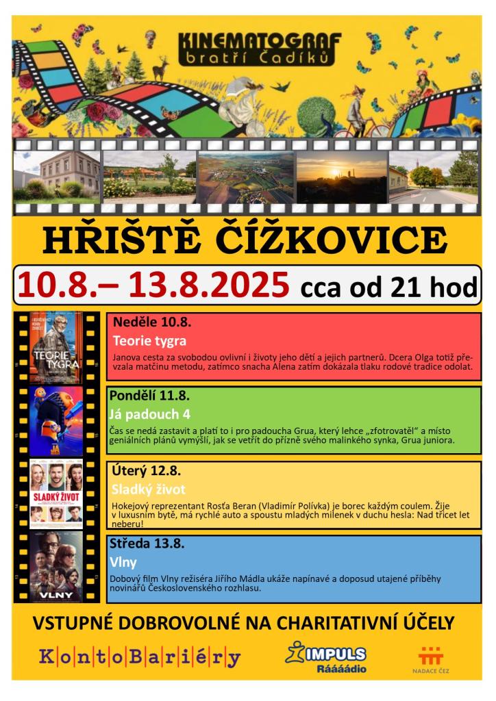 Kinematograf bratří Čadíků opět navštíví naší obec a to v termínu od 10.8.-13.8.2025. Seznam filmů naleznete na plakátě.