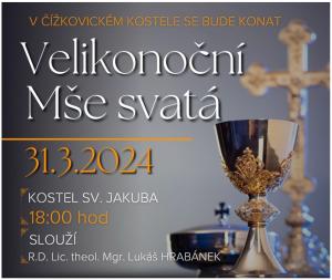 V kostele sv. Jakuba v Čížkovicích se uskuteční Velikonoční Mše Svatá a to v neděli 31.3.2024 od 18.hod.