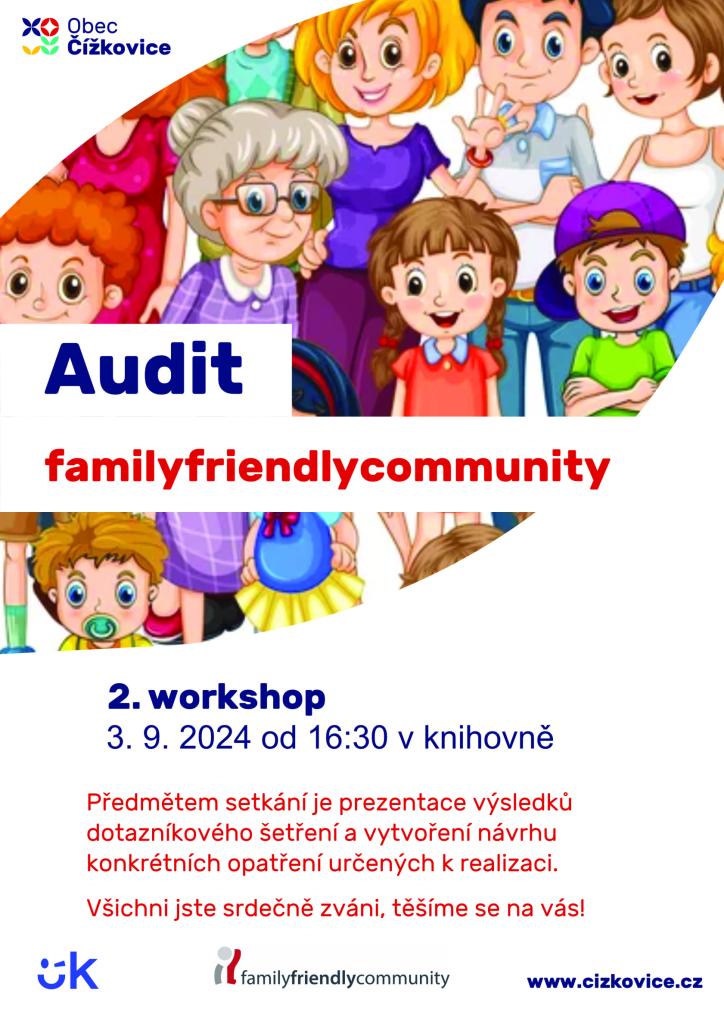 Obec Čížkovice všechny srdečně zve na konání 2. workshopu k auditu familyfriendlycommunity, který se bude konat 3.9.2024 od 16:30 hod v místní knihovně na OÚ.