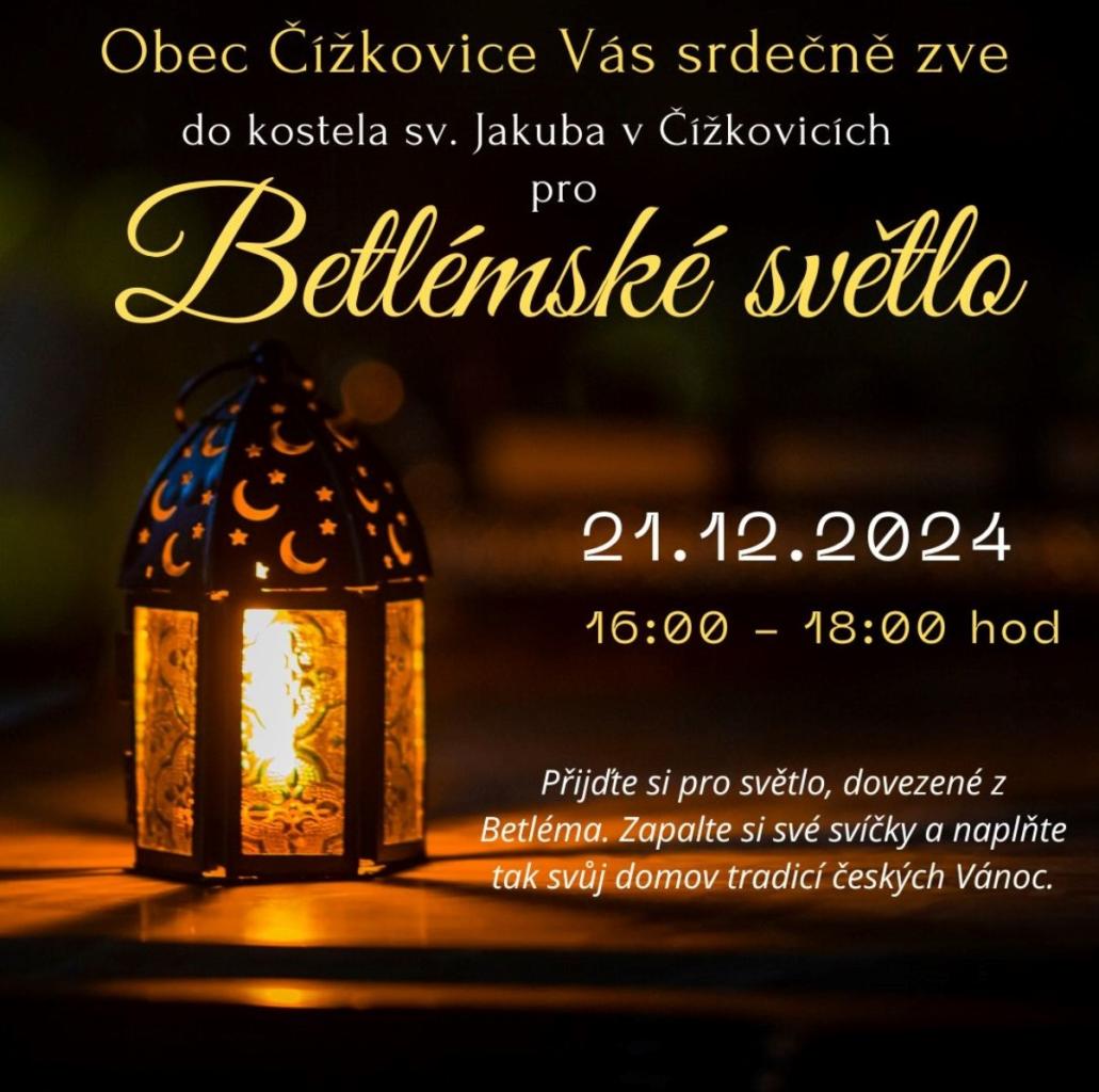 Přijďte si se svou lucerničkou pro Betlémské světlo do kostela sv. Jakuba v Čížkovicích - 21.12.2024 od 16. - 17. hod