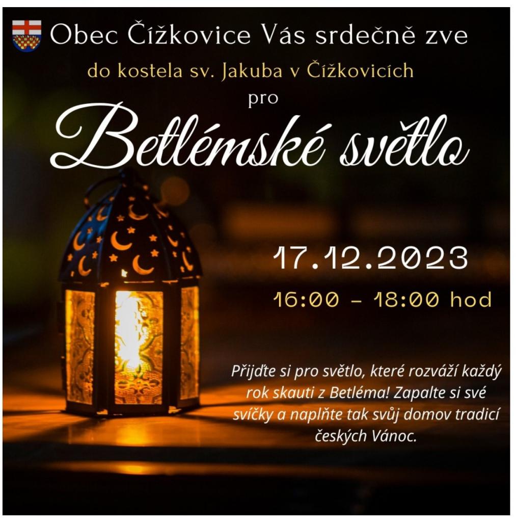 Obec Čížkovice Vás srdečně zve 17.12.2023 do kostela sv. Jakuba, kam si můžete přijít se svou lucerničkou pro Betlémské světlo.