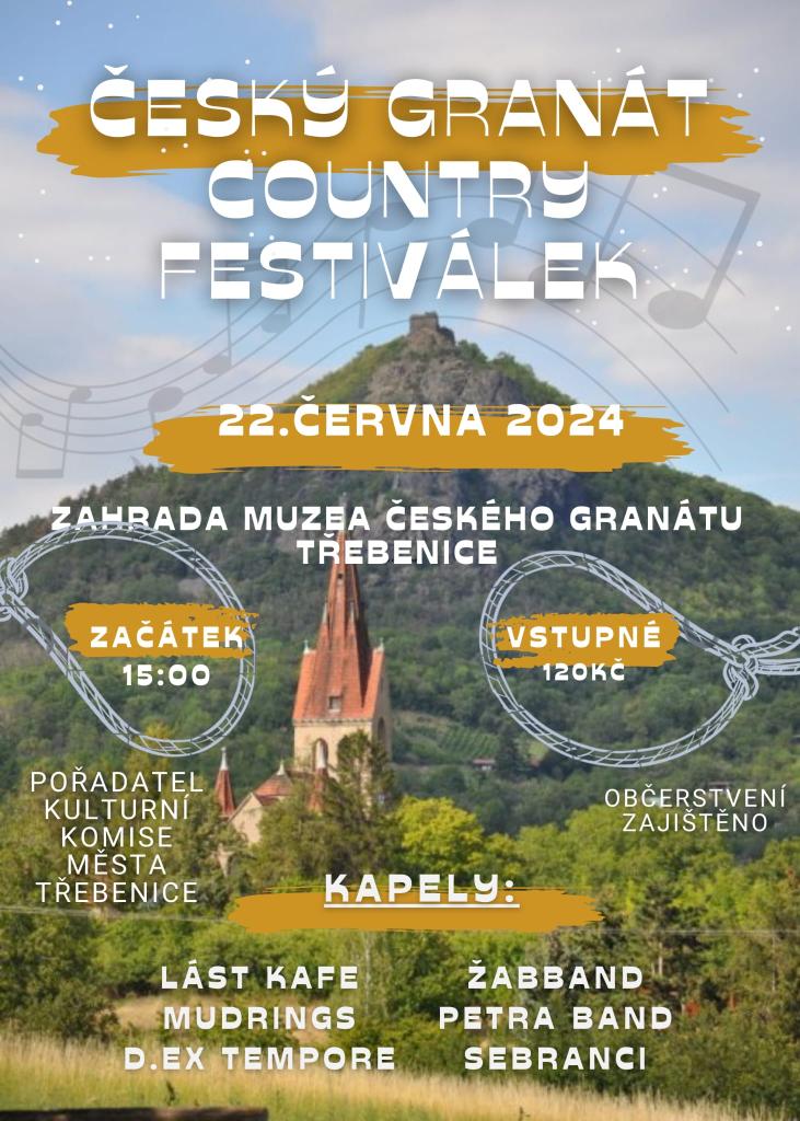 Kulturní komise města Třebenice vás srdečně zve na "Český granát country festiválek", který se bude konat 22.6.2024 v zahradě Muzea Českého granátu.