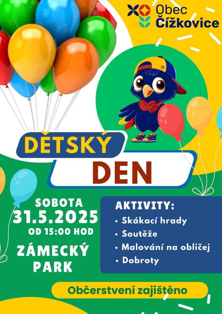 Zveme všechny malé i velké na dětský den, který se bude konat v sobotu 31.5.2025 od 15h v Zámeckém parku.