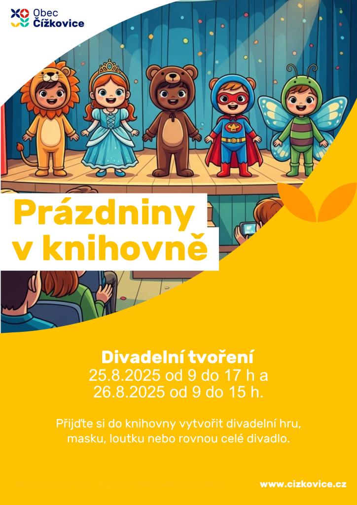 Přijďte si do knihovny vytvořit divadelní hru, masku, loutku nebo rovnou celé divadlo. 25.8.2025 - 9:00 - 17:00 hod 26.8.2025 - 9:00 - 15:00 hod