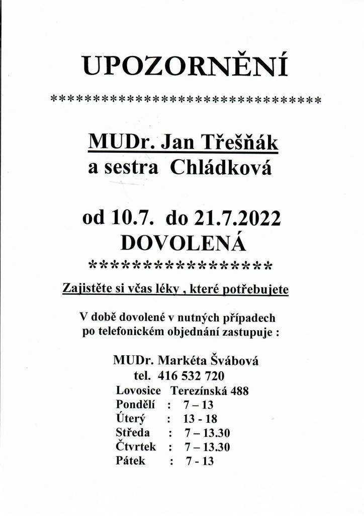 Dovolená MUDr. Třešňák - 10.7. - 21.7.2023 Zástup MUDr. Markéta Švábová