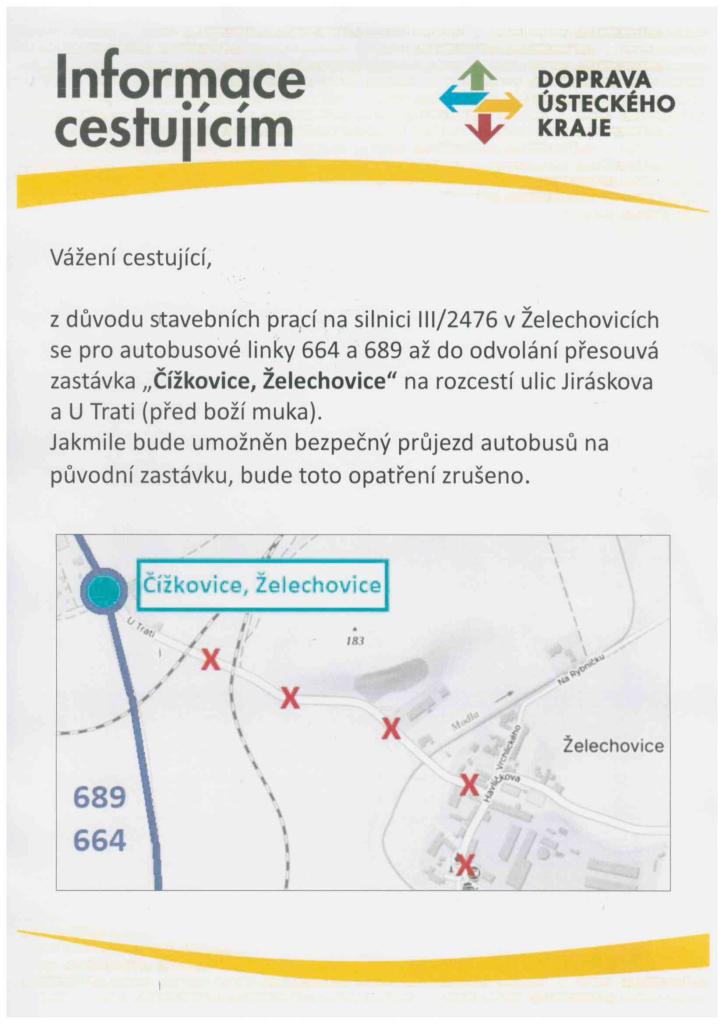 Z důvodu stavebních prací na silnici III/2476 v Želechovicích se pro autobusové linky 664 a 689 až do odvolání přesouvá zastávka „Čížkovice, Želechovice“ na rozcestí ulic Jiráskova