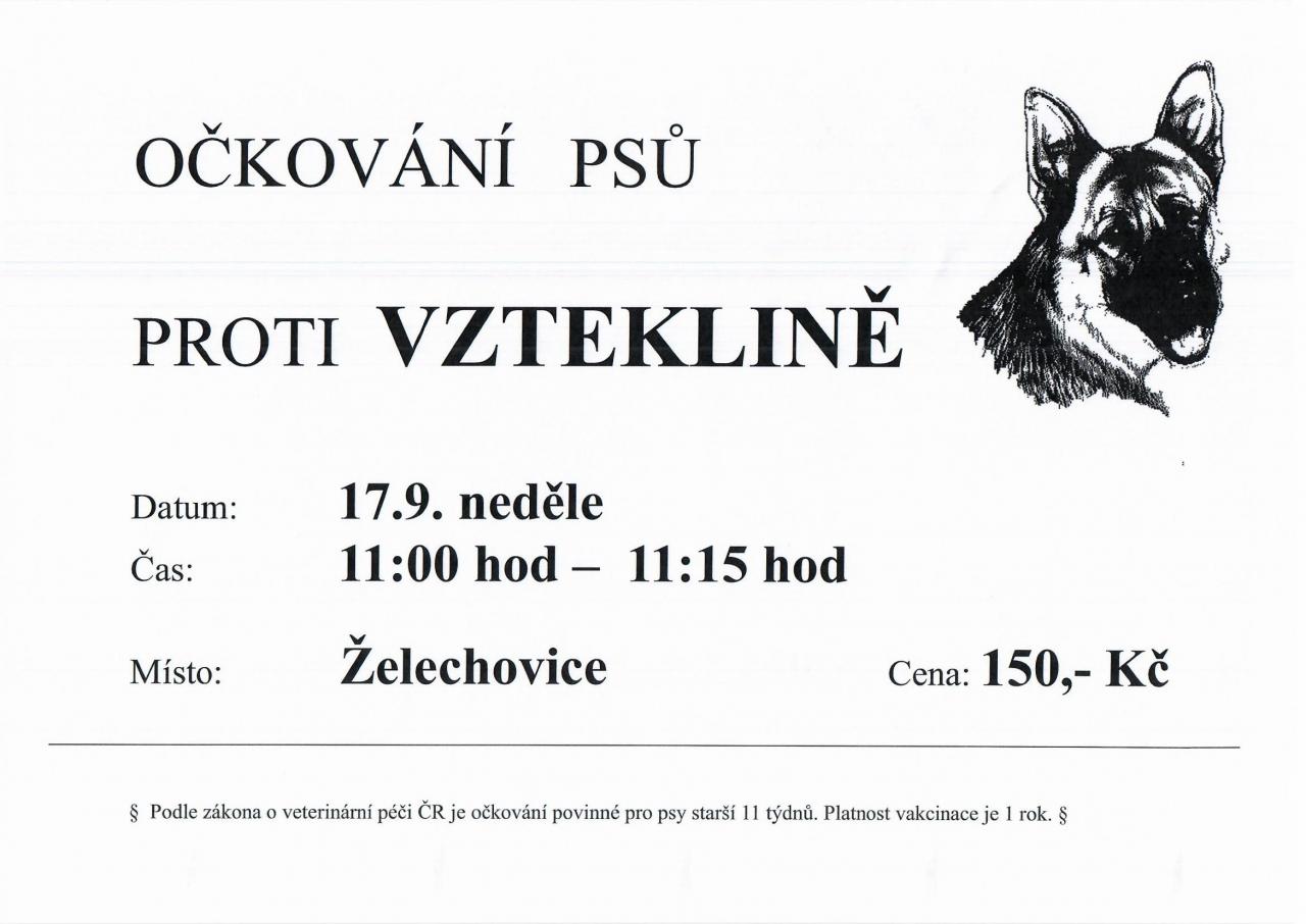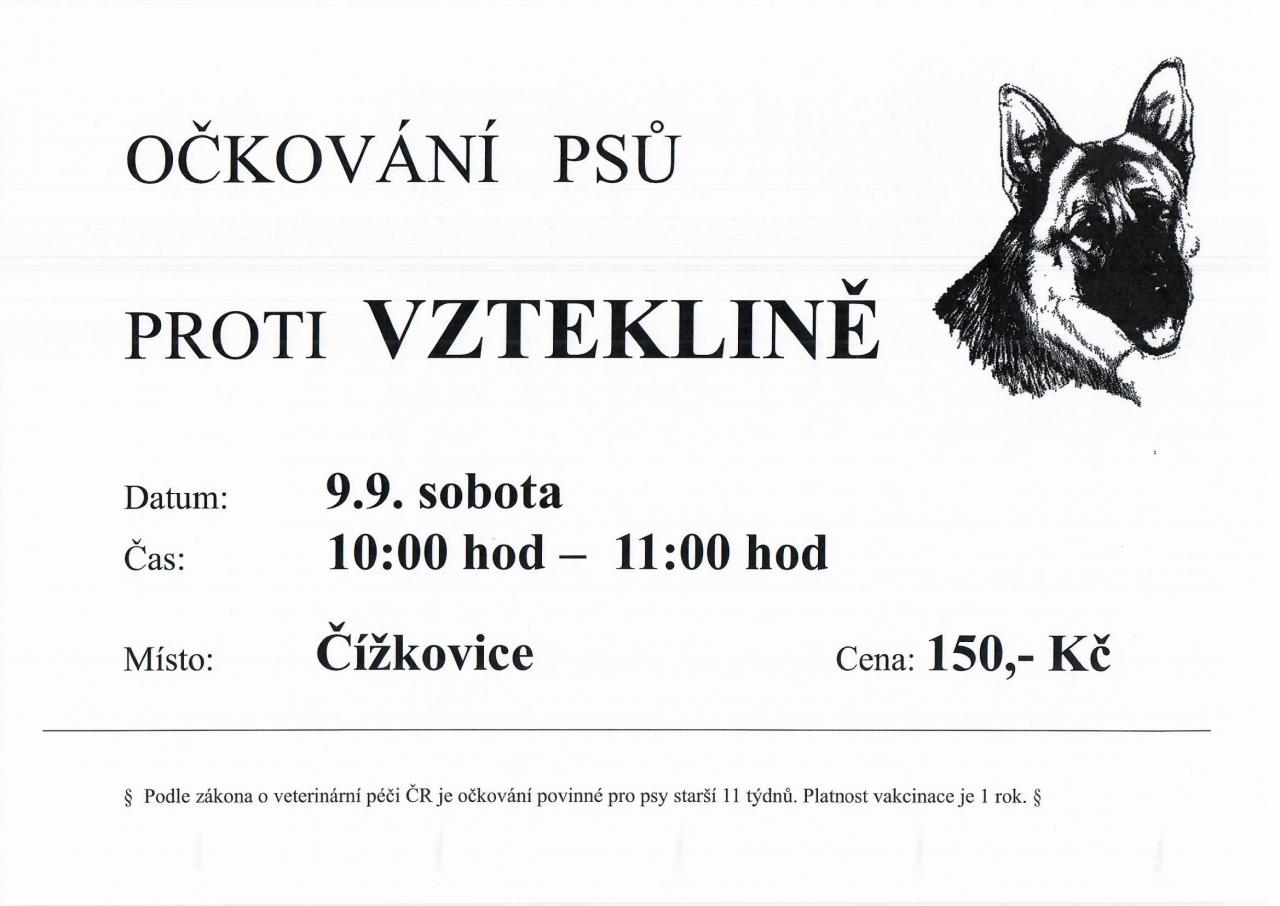 V sobotu 9.9.2023 od 10 - 11hod bude probíhat očkování psů proti vzteklině v obci Čížkovice. A v neděli 17.9.2023 od 11 - 11:15hod v obci Želechovice. Cena očkování je 150,-Kč.