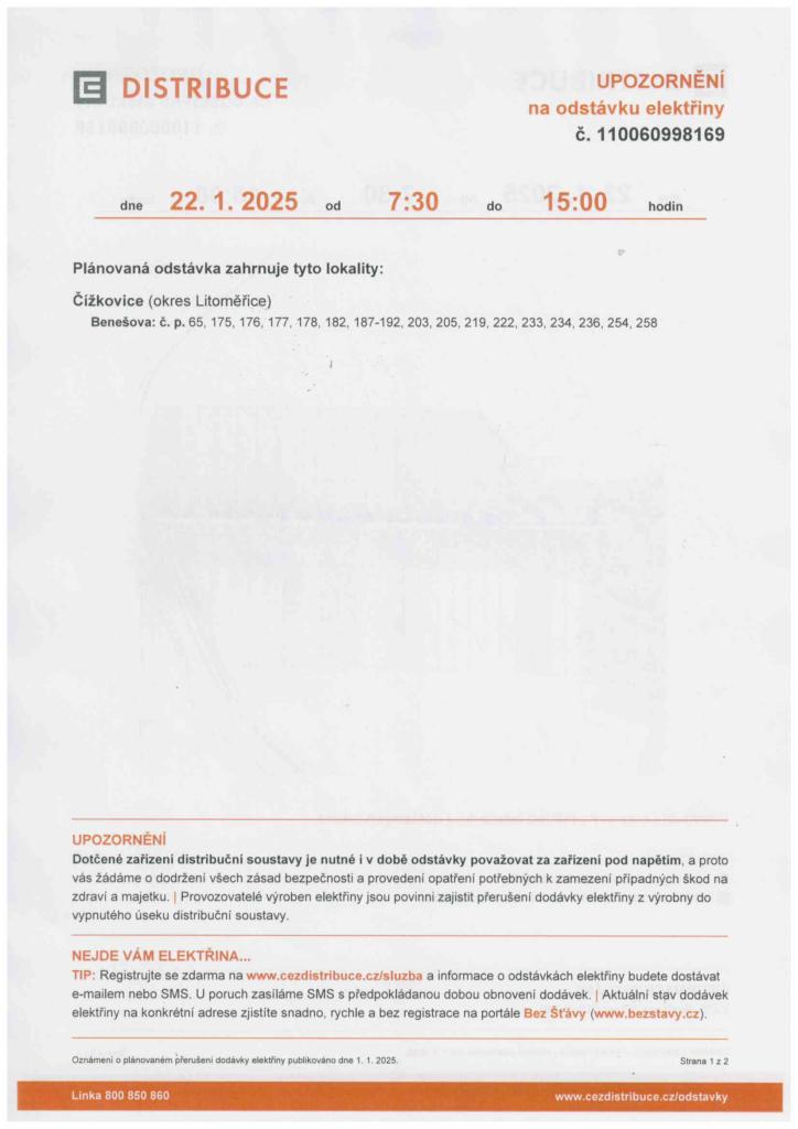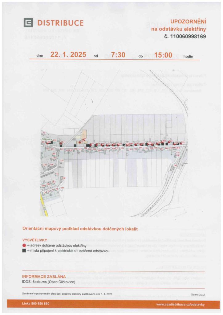 ČEZ Distribuce oznamuje, že 22.1.2025 od 7:30h do 15:00h bude přerušena dodávka el. energie. Dotčená místa viz příloha