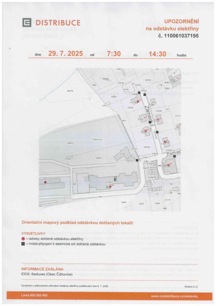 ČEZ Distribuce oznamuje, že dne 29.7.2025 od 7:30 - 14:30h bude přerušena dodávka el. energie v ul. Zámecká (čp. 294, 298, 299, 300, 304 15) + parc. č. 303/4, 319/21, 319/31
