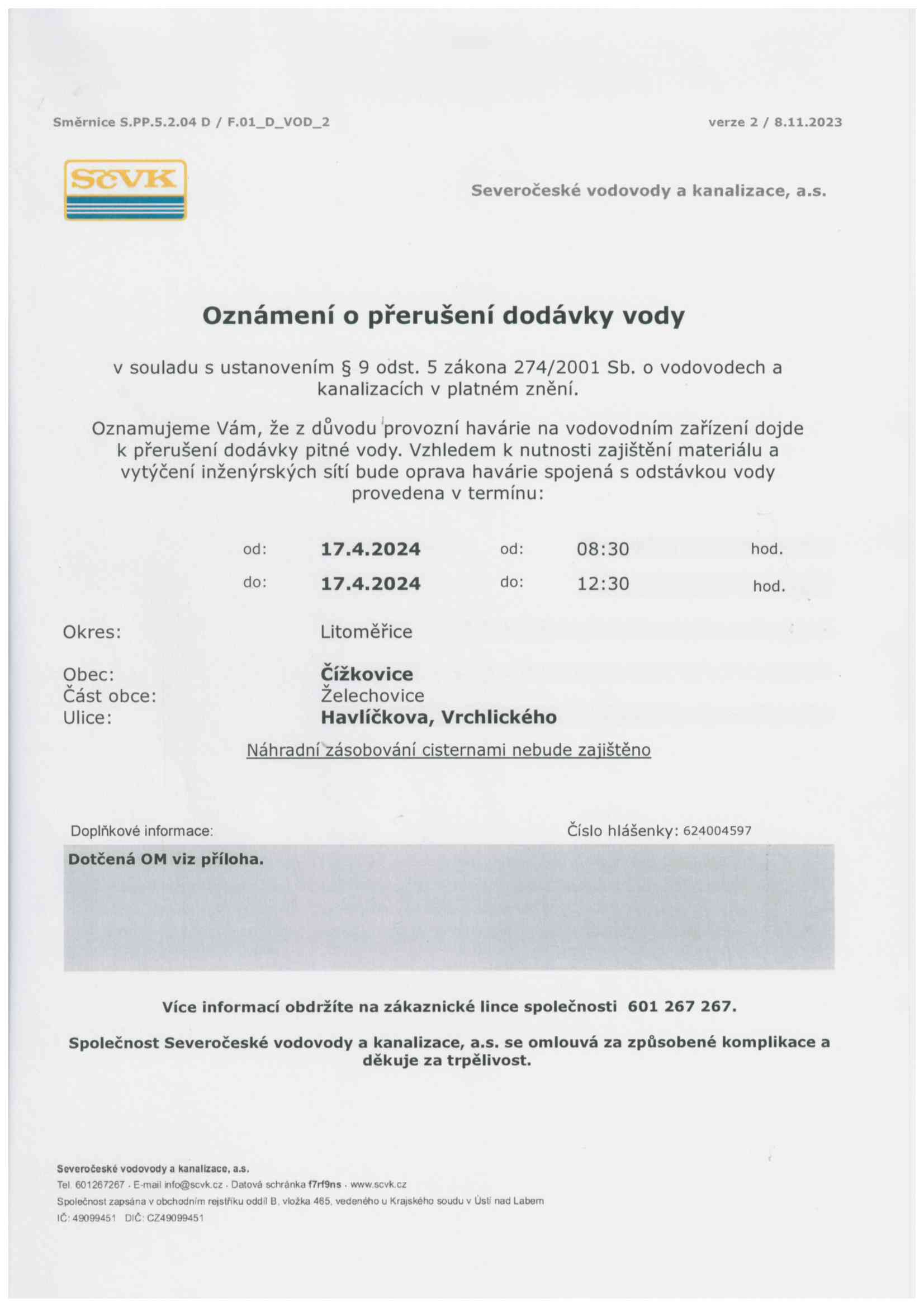 SČVK oznamuje, že z důvodu provozní havárie na vodovodním zařízení dojde k přerušení dodávky pitné vody a to: 17.4.2024 od 8:30h - 12:30hod. Seznam čísel popisných viz příloha