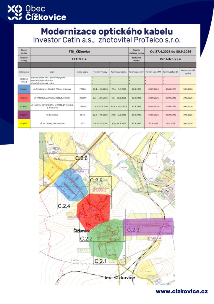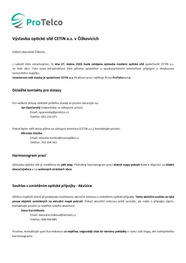 Výstavba optické sítě CETIN a.s. v Čížkovicích. 27.4.2026 bude zahájena výstavba moderní optické sítě společnosti CETIN a.s. v Čížkovicích.