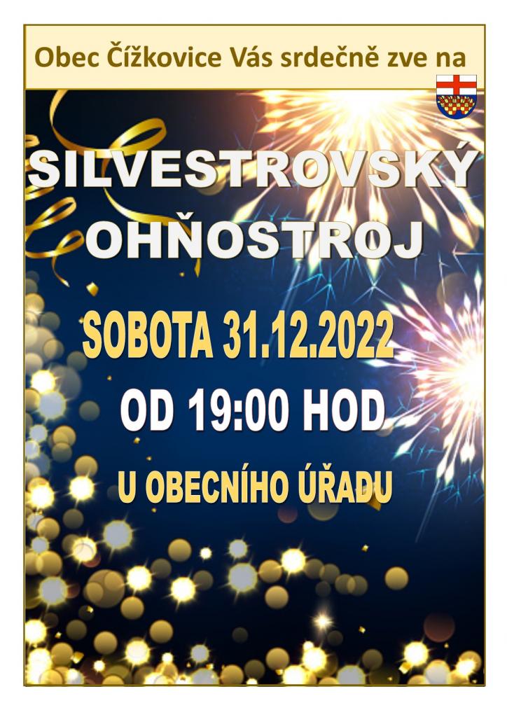 Obec Čížkovice Vás srdečně zve na již tradiční silvestrovský ohňostroj. V sobotu 31.12.2022 od 19:00 hod u obecního úřadu.