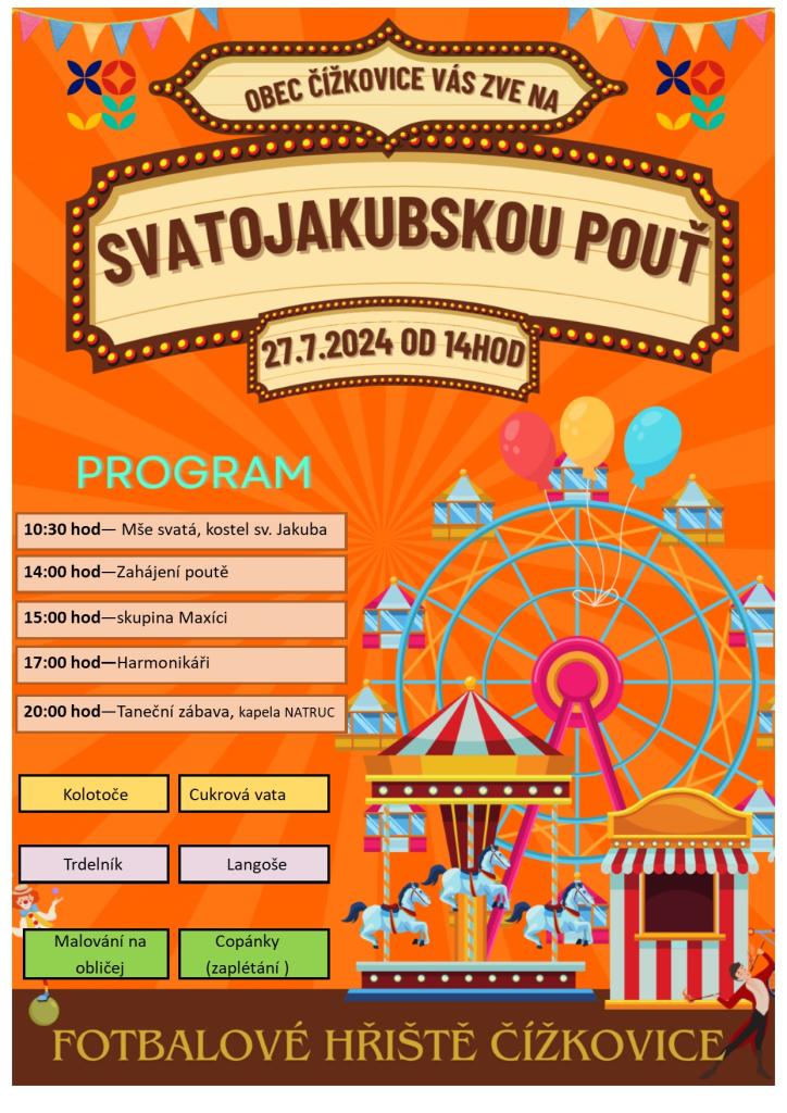 Obec Čížkovice Vás srdečně zve na Svatojakubskou pouť, která se bude konat v sobotu 27.7.2024 od 14:00h v areálu fotbalového hřiště. Od 10:30h proběhne v kostele sv. Jakuba Mše svatá