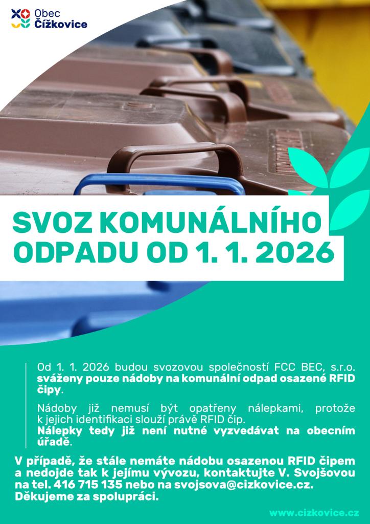 Od 1.1.2026 budou svozovou společností FCC BEC, s.r.o. sváženy pouze nádoby na komunální odpad osazené RFID čipy. Nálepky již není nutné vyzvedávat na obecním úřadě. V případě dotazů, kontaktujte paní V. Svojšovou.