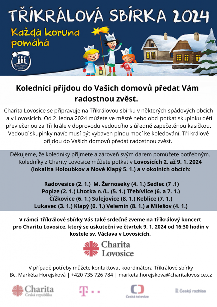 Charita Lovosice se připravuje na Tříkrálovou sbírku. Koledníci přijdou do Vašich domovů předat Vám radostnou zvěst 6.1.2024.