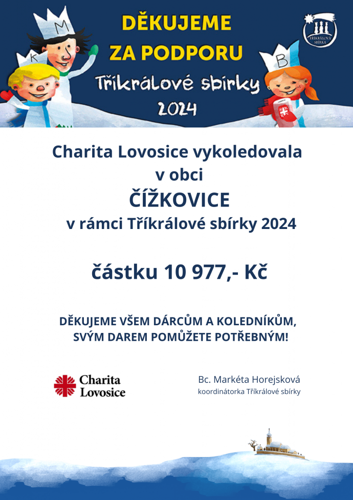 Charita Lovosice tímto děkuje za podporu v rámci Tříkrálové sbírky 2024. V naší obci se vybralo krásných 10 977,-Kč.