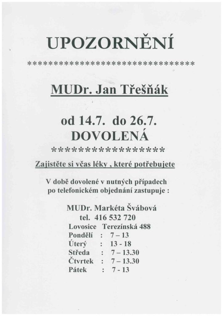 MUDr. Jan Třešňák od 14.7. do 26.7.2025 Dovolená