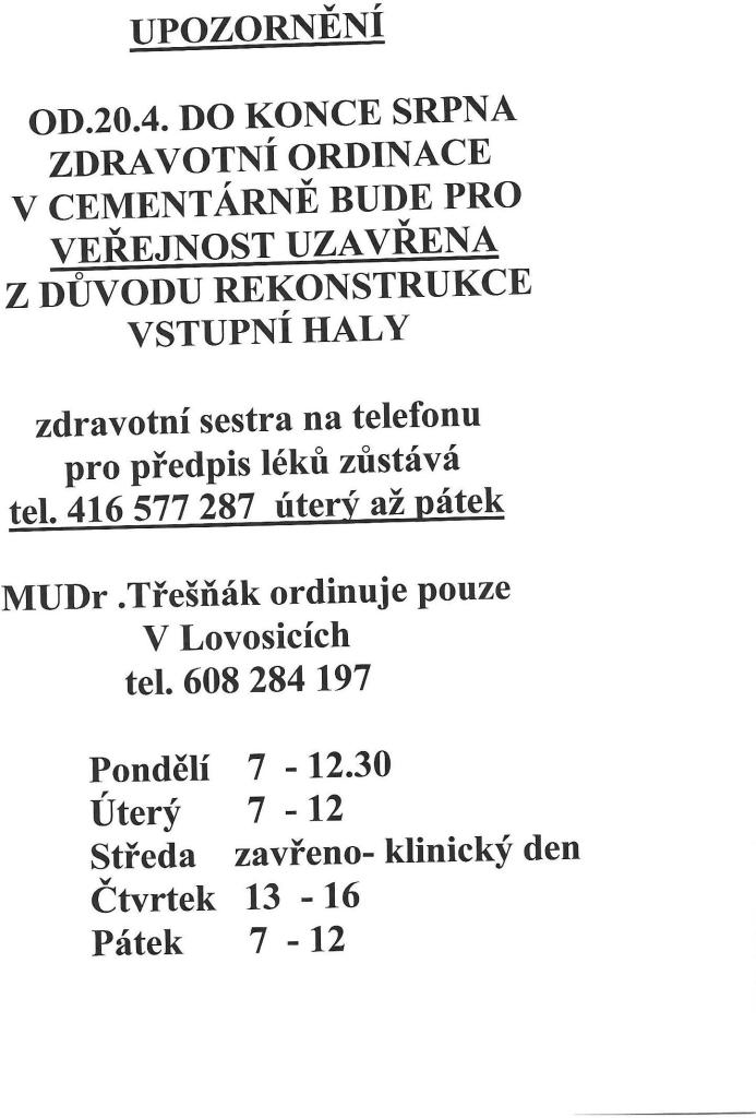 Upozornění - Mudr. Třešňák ordinační hodiny - 04/2026. Od 20.4.2026 do 31.8.2026 bude pro veřejnost uzavřena ordinace v Cementárně z důvodu rekonstrukce vstupní haly. Zdravotní sestra bude na tel. viz níže