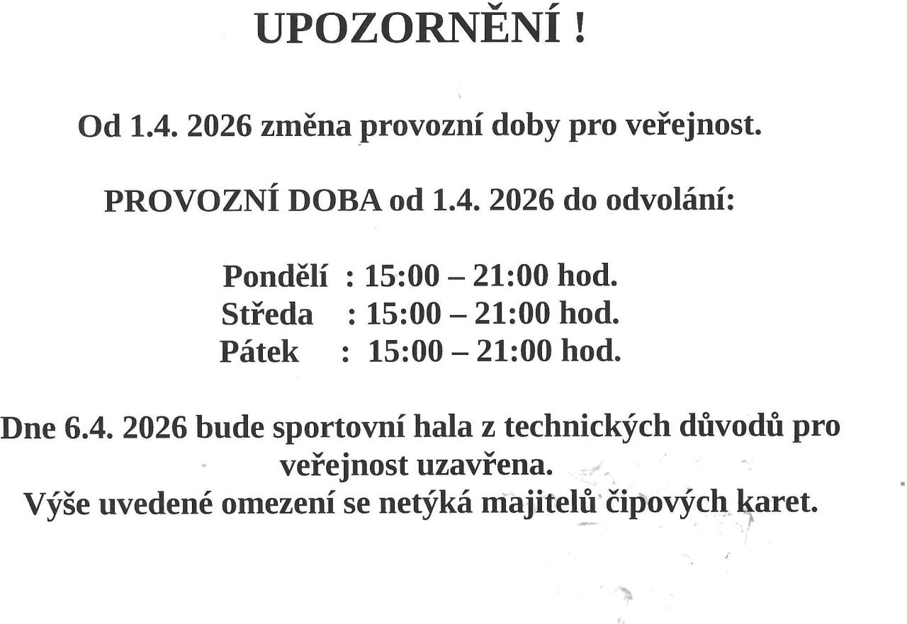 Od 1.4.2026 bude změna provozní doby pro veřejnost ve sportovní hale a posilovně: PO - 15:00 - 21:00 ST - 15:00 - 21:00 PÁ - 15:00 - 21:00 Dne 6.4.2026 bude sportovní hala z technických důvodů pro veřejnost uzavřena.