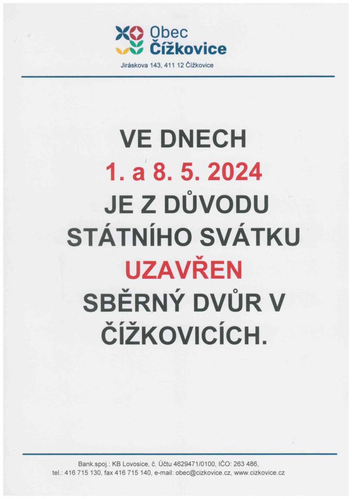 Ve dnech 1. a 8. května 2024 je z důvodu státního svátku uzavřen sběrný dvůr v Čížkovicích.