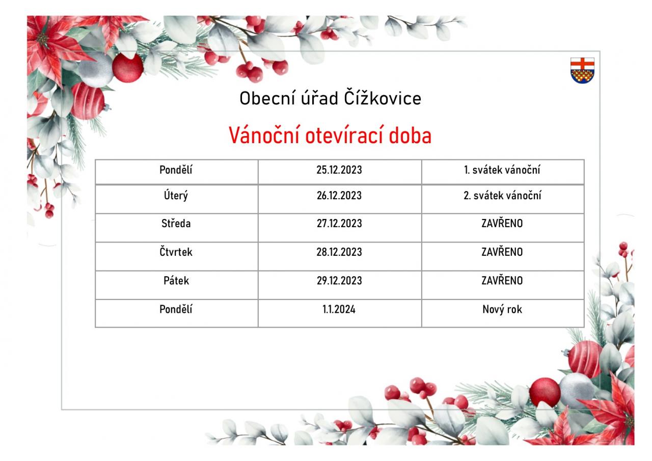 Vánoční otevírací doba obecního úřadu Čížkovice
