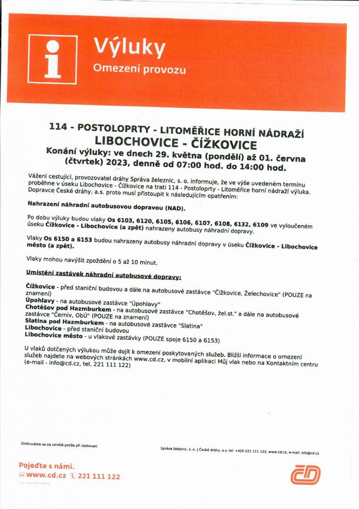 Správa železnic oznamuje, že ve dnech od 29.5.-1.6.2023 dojde k výluce na trase POSTOLOPRTY-LITOMĚŘICE-LIBOCHOVICE-ČÍŽKOVICE, denně od 7:00 - 14:00 hod. Nahrazení náhradní autobusovou dopravou.