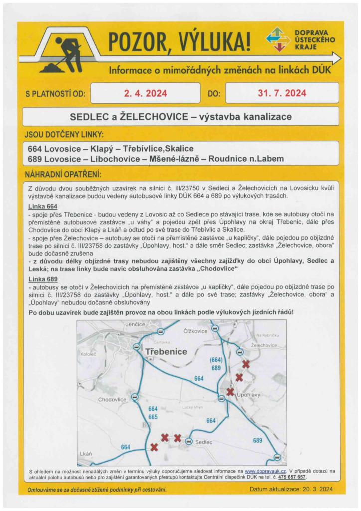 Z důvodu dvou souběžných uzavírek na silnici č. III/23750 v Sedleci a Želechovicích budou vedeny autobusové linky DÚK 664 a 689 po výlukových trasách. Zastávka " Želechovice Obora" bude dočasně zrušena.
