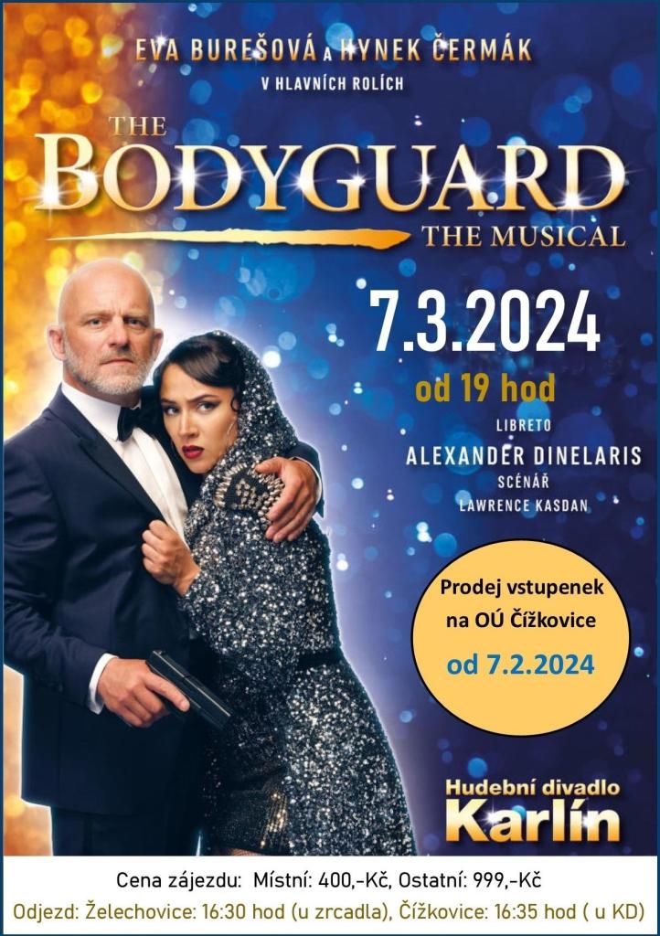 Obec Čížkovice pořádá zájezd na muzikál The Bodyguard, který se bude konat 7.3.2024 od 19 hod v Hudebním divadle Karlín. Lístky v prodeji od středy 7.2.2024 na OÚ Čížkovice.