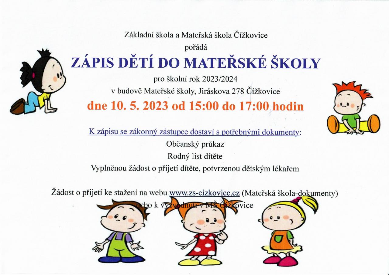 Základní a Mateřská škola pořádá Zápis dětí do mateřské školy pro rok 2023/2024 - kritéria pro přijetí naleznete viz níže pod plakátem