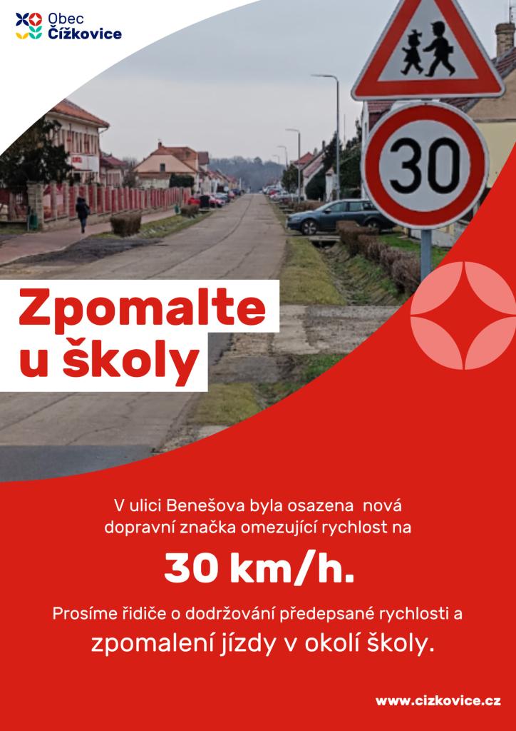 V ulici Benešova byla osazena nová dopravní značka omezující rychlost na 30 km/h.