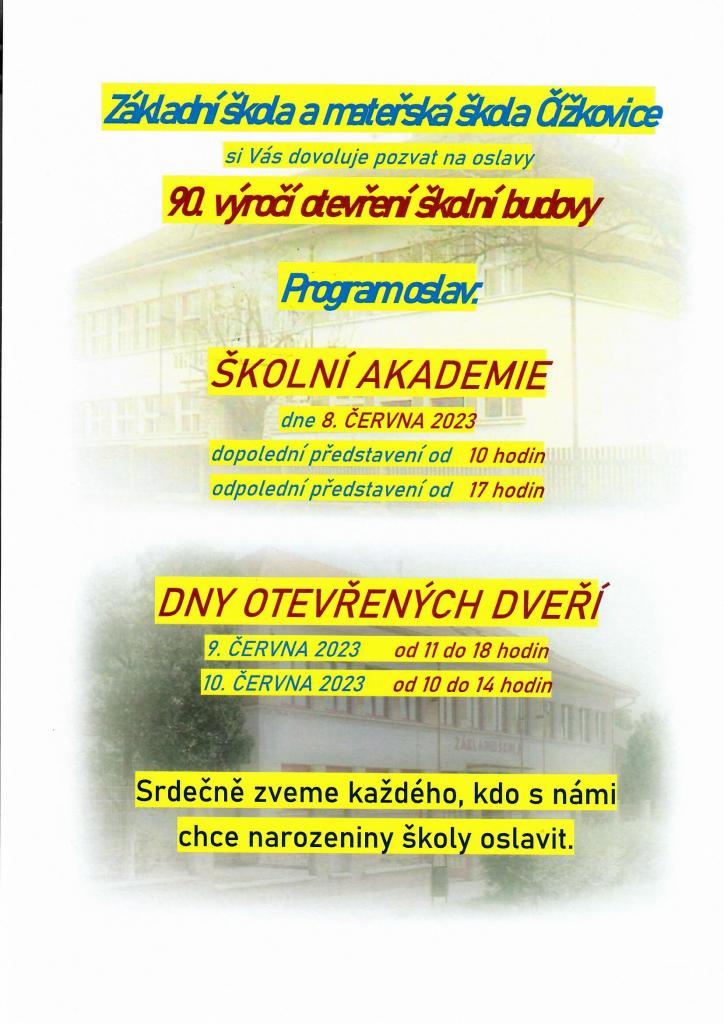 ZŠ a MŠ Čížkovice si Vás dovoluje pozvat na školní akademii, která se bude konat 8.6.2023 a dny otevřených dveří, které budou probíhat ve dnech 9. a 10.6.2023 ku příležitosti 90. výročí školy.
